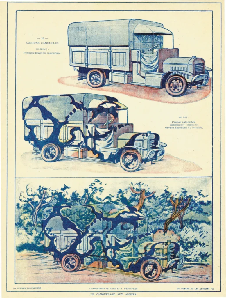 Pendant la Première Guerre mondiale, des artistes français ont fini par convaincre l’état-major de l’intérêt de dissimuler les canons pour que l’ennemi ne les repère pas. Comment ? Avec des toiles peintes ! idem avec les avions peints selon les décors du ciel